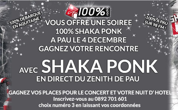 Après les régions Midi-Pyrénées et Languedoc-Roussillon, 100 % émet depuis quelques jours en Aquitaine dans la ville de Pau sur la fréquence 98 FM. Pour fêter l'événement, Wilfried sera aujourd'hui en direct du Zénith de Pau à partir de 16h et recevra à 17h, le groupe Shaka Ponk avant leur concert de ce soir.