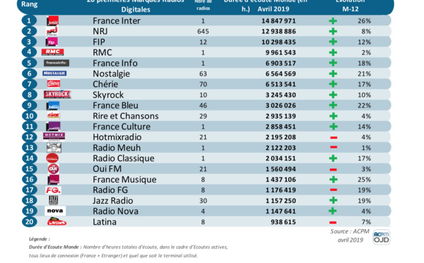En partenariat avec l'Alliance pour les Chiffres de la Presse et des Médias, nous publions désormais tous les mois, un classement exclusif de la durée d'écoute des stations certifiées par l'ACPM/OJD. Un classement à retrouver dans La Lettre Pro de la Radio.