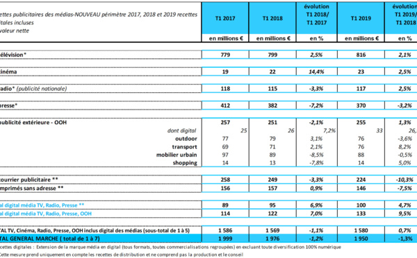 Au 1er trimestre 2019, sur le périmètre observé par l’IREP (télévision, cinéma, radio, presse, publicité extérieure, courrier publicitaire, Isa), les recettes publicitaires nettes des médias s’établissent 1,950 milliard d’euros, en baisse de -1,3% par rapport au 1er trimestre 2018. Au 1er trimestre 2018, la tendance était quasiment identique, à -1,2% vs le 1er trimestre 2017.