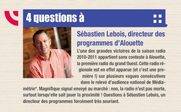 L’une des grandes victoires de la saison radio 2010-2011 appartient sans conteste à Alouette, la première radio du grand Ouest. Cette radio régionale est en effet apparue (et c’est une première !) sur plusieurs vagues consécutives dans le relevé d’audience national de Médiamétrie*. Magnifique signal envoyé au marché : non, la radio n’est pas morte, surtout lorsqu’elle sait jouer la proximité ! Questions à Sébastien Lebois, un directeur des programmes forcément très souriant.