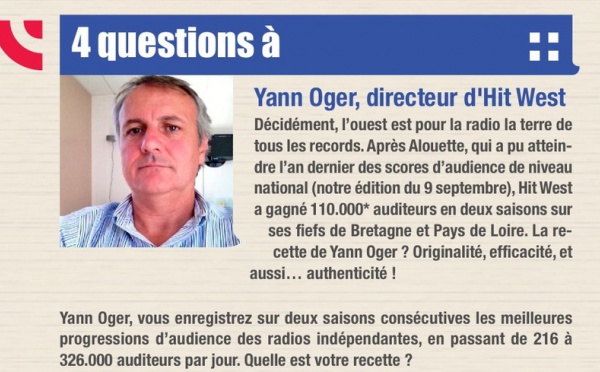 Décidément, l’ouest est pour la radio la terre de tous les records. Après Alouette, qui a pu atteindre l’an dernier des scores d’audience de niveau national (notre édition du 9 septembre), Hit West a gagné 110.000* auditeurs en deux saisons sur ses fiefs de Bretagne et Pays de Loire. La recette de Yann Oger ? Originalité, efficacité, et aussi… authenticité !