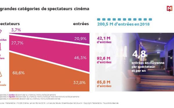 En 2018, les salles ont accueilli 41.6 millions de spectateurs, soit plus des 2/3 de la population française. Un nombre élevé qui toutefois se stabilise depuis 2016. Trois genres se sont particulièrement démarqués : les films d’action/aventure/science fiction/fantastique, les comédies et les drames ont engrangé, à eux seuls, plus des 2/3 des 200.5 millions d’entrées réalisées sur l’année.