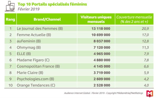 Trois femmes CSP+ sur 4 consultent les portails féminins. En février 2019, selon Médiamétrie, 27 millions de visiteurs uniques ont consulté les sites et applications spécialisés sur l’univers féminin, soit 42,9% de la population française.