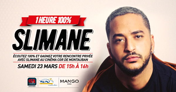 Ce samedi 23 mars, le réseau régional du Sud-Ouest de la France, 100% invite 300 auditeurs à assister à l’émission "1 heure – 100%" avec la chanteur Slimane. cette émission se déroulera au cinéma CGR de Montauban sous la forme d'un enregistrement d’une émission spéciale délocalisée en public.