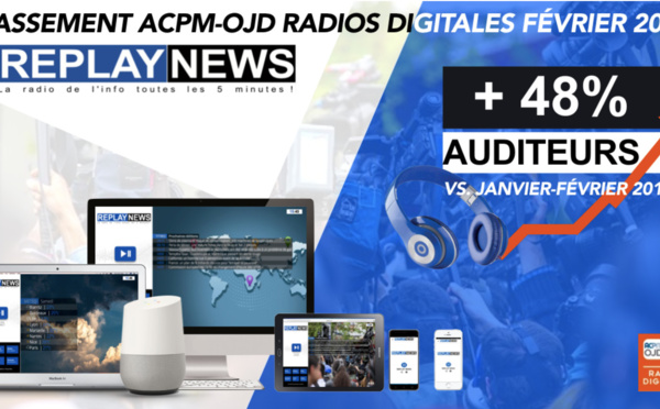 Diffusée depuis le mois de septembre 2018, Replay News (dernière née du groupe Radio Public Santé) vient de d'apparaître pour la deuxième fois dans le classement ACPM-OJD des radios numériques. Replay News a enregistré une hausse de 48% de son audience en février dernier.