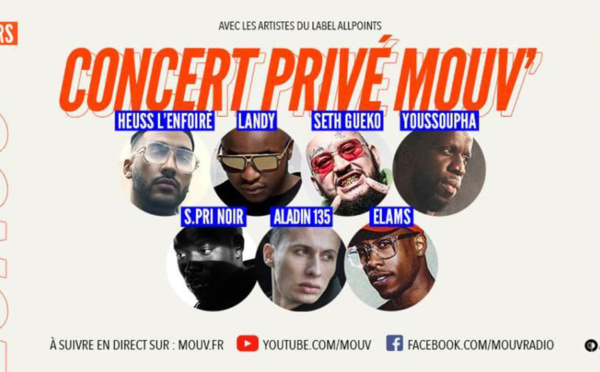 Mouv’ propose un concert privé avec 7 artistes du label AllPoints, mercredi 27 mars à 20h30. Heuss L’Enfoiré, Landy, Seth Gueko, Youssoupha, S.Pri Noir, Aladin 135 et Elams se succèderont sur le plateau du Studio 104 de Radio France pour un show exclusif de deux heures, diffusé en direct sur Mouv’.