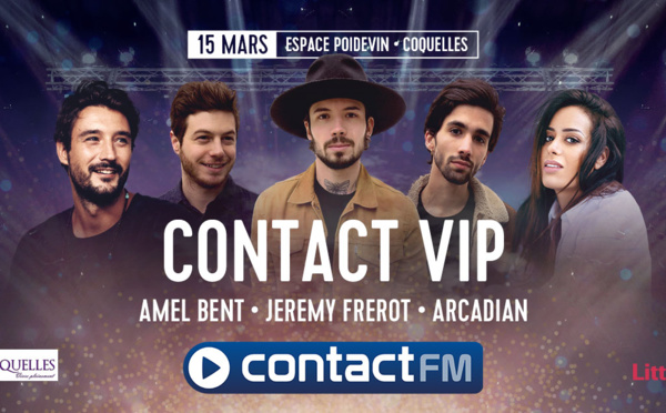 Contact FM organise un "Contact VIP", ce vendredi 15 Mars à 20h à la Salle Poidevin à Coquelles (Pas-de-Calais). La radio invite 1 300 auditeurs un nouveau concert privé avec sur scène Amel Bent, Jérémy Frérot et Arcadian.