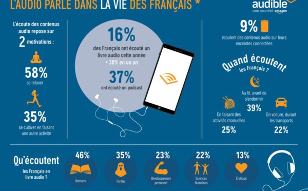 À l’occasion du Salon Livre Paris 2019, Audible dévoile les derniers chiffres de son baromètre annuel réalisé par Opinéa auprès de 3 109 Français. Des résultats qui confirment la tendance forte du livre audio dans les pratiques culturelles quotidiennes des Français.