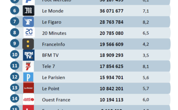 Seules 3 radios se positionnent dans le Top 20 des applications les plus consultées en janvier dernier : franceinfo et France Inter (Radio France) respectivement à la 9e et à la 15e place et RMC (NextRadioTV) à la 17e place.