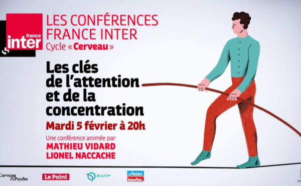 "Les clés de l’attention et de la concentration". Voilà le thème de la prochaine conférence de France Inter, le mardi 5 février à partir de 20h au Studio 104 à la maison de la radio. Une conférence du cycle "Cerveau" animée par Mathieu Vidard et Lionel Naccache et retransmise en direct simultané dans une centaine de salles de cinéma partenaires partout en France.