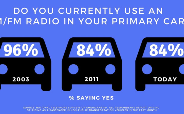 Edison Research, en collaboration avec NPR, a récemment suivi les résultats de deux études antérieures réalisées par Edison sur la consommation audio embarquée. Cette étude a révélé qu'en 2018, 84% des automobilistes ou passagers américains écoutent la radio AM / FM. De manière significative, c'est exactement le même pourcentage que dans une précédente étude de 2011.