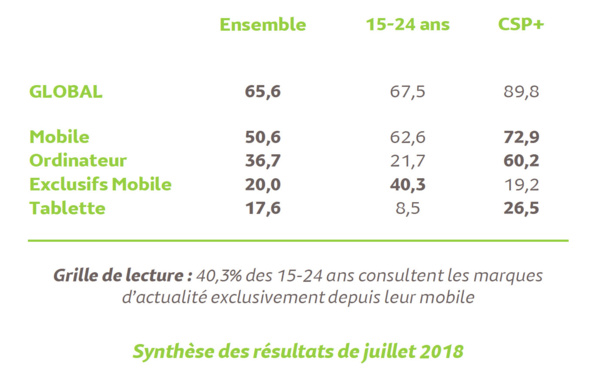 En juillet, 41.2 millions d’internautes ont visité au moins un site ou une application d’Actualités, soit 65.6% de la population française. Un tiers de ces visiteurs (36.8%) l'ont fait chaque jour. Le téléphone mobile est largement privilégié pour s’informer en ligne : en juillet, plus de la moitié des Français (50.6%) l’ont utilisé à cet effet et 20% ont même utilisé uniquement cet écran.