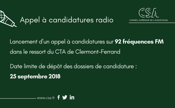 Le CSA a lancé, le 4 juillet 2018, un appel à candidatures pour l’exploitation de services de radio par voie hertzienne terrestre en modulation de fréquence à temps complet dans le ressort du comité territorial de l’audiovisuel de Clermont-Ferrand. 92 fréquences sont concernées.