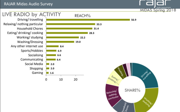 Selon l’étude britannique Rajar Midas Audio Survey, l’écoute radio en conduisant domine les activités des auditeurs. Mais les autres activités pratiquées en écoutant la radio illustrent bien l’atout incomparable du média radio : la capacité d’écouter en faisant autre chose, ce qui n’est pas le cas de la plupart des autres médias, et ce qui est précieux compte tenu du peu de temps quotidien de cerveau disponible.