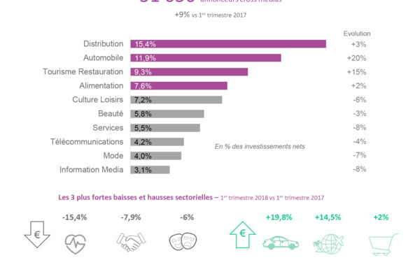 Au 1er trimestre 2018, sur le périmètre observé par l’IREP (télévision, cinéma, radio, presse, publicité extérieure, courrier publicitaire, isa), les recettes publicitaires nettes des médias s’établissent à 1 920 millions €, en diminution de -2.0% par rapport au 1er trimestre 2017. La radio affiche une baisse de 3.6%.