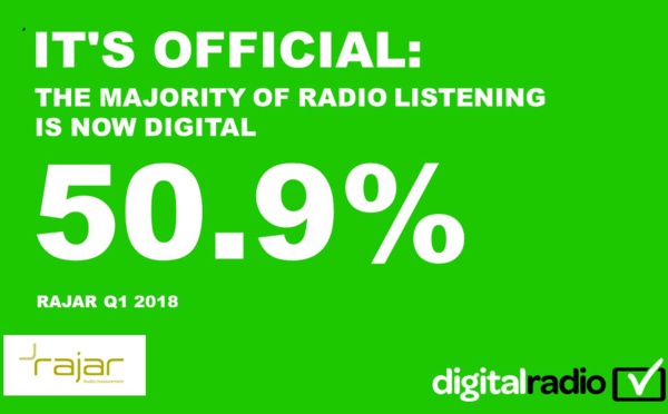 L'industrie de la radio britannique a salué un événement majeur : l'écoute numérique atteint une nouvelle part record de 50.9%, contre 47.2% il y a un an, pour la première fois, selon RAJAR. On est déjà loin des 24% du 1er trimestre 2010, lorsque le Plan d'action de la radio numérique du gouvernement, qui impulsait un programme visant à faire progresser la radio numérique, avait été lancé.