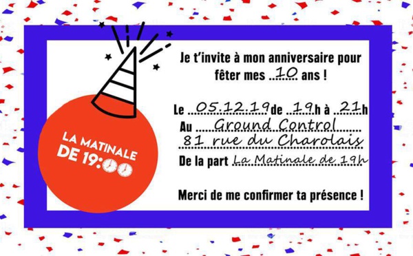 "La Matinale de 19h" diffusée sur Radio Campus Paris fête rases 10 ans au Ground Control le jeudi 5 décembre de 19h à 21h. Dix ans de matinale, c'est avant tout 10 ans d'une émission rédactionnelle qui a réunit des centaines de bénévoles passionnés autour d'un projet commun.