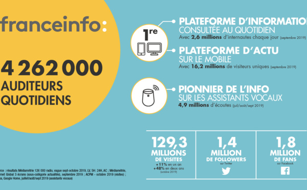 Ainsi qualifie la chaîne de Radio France pour expliquer ses résultats issus de la vague septembre-octobre 2019 de la 126 000 Radio de Médiamétrie. La radio franceinfo est écoutée chaque jour par 4 262 000 auditeurs. Elle confirme sa place de 4e radio la plus écoutée de France avec une audience cumulée de 7.9%.