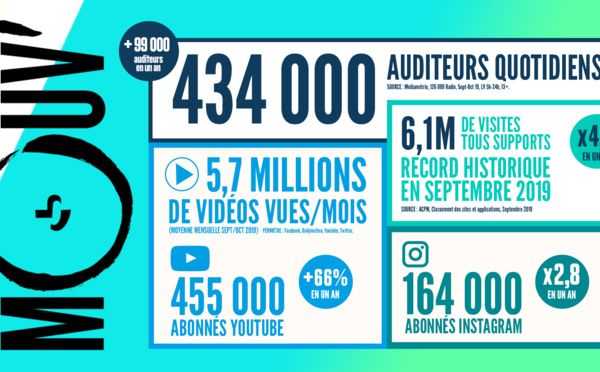 Avec près de 100 000 nouveaux auditeurs quotidiens en un an, Mouv’ atteint 0.8% d’audience cumulée (+0,2 point), soit 434 000 auditeurs quotidiens. C'est presque suffisant pour atteindre le point d'audience...