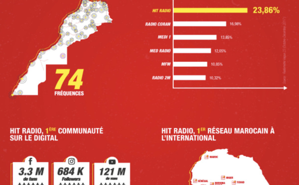 Au Maroc, Hit Radio est écoutée par 3 millions d'auditeurs chaque jour en semaine et 2,4 millions les jours de week-ends, selon les dernières mesures d'audience de la radio publiées par le CIRAD (le Centre interprofessionnel de mesure d'audience radio). La station musicale a donc fidélisé 300 000 nouveaux auditeurs en un trimestre.