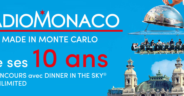 À l’occasion de ses 10 ans, Radio Monaco organise du 26 juin au 7 juillet un jeu-concours en partenariat avec la société Just Unlimited, organisatrice de "Dinner in the Sky Monte-Carlo". À gagner, un déjeuner gastronomique pour 2 personnes dans une nacelle suspendue à 50 mètres au-dessus des terrasses du Casino de Monte-Carlo d’une valeur de 2 000 euros.