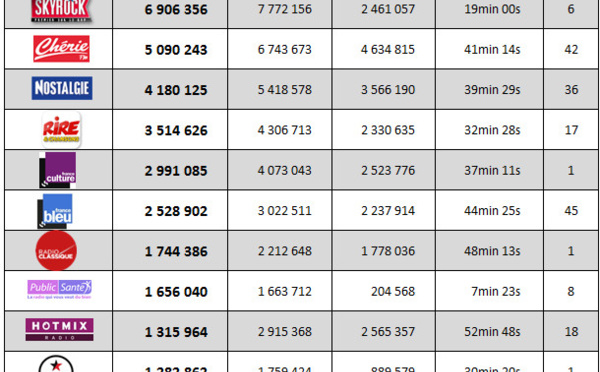 En février dernier, les radios adhérentes à l'Alliance pour les Chiffres de la Presse et des Médias (ACPM) ont totalisé plus de 107 millions de sessions d’écoutes en France, dont 75 millions pour les radios Hertziennes.NRJ reprend la tête de ce classement devant France Inter, RMC, France Info et FIP.