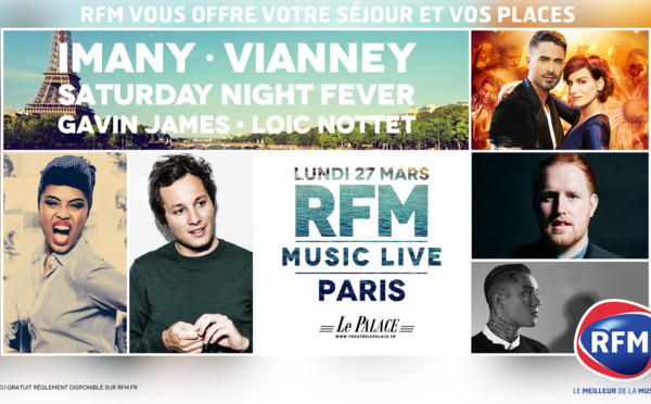 Ce lundi, l'équipe de RFM s'installera au Palace à Paris pour un nouveau RFM Music Live qyui réunira Imany, Vianney, Gavin James, Loïc Nottet et la troupe de Saturday Night Fever. Réservé aux auditeurs de RFM, ce concert gratuit sera également diffusée en Facebook Live sur la pafe Facebook de RFM.