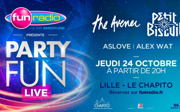 Pour ce premier "Party Fun Live" de la saison 2019/2020, les auditeurs de Fun Radio ont rendez-vous, jeudi 24 octobre à Lille depuis le Chapitô, avec un line-up de choix : The Avener, Petit Biscuit et Aslove.
