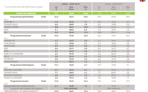 Ce matin, Médiamétrie a publié les résultats d'audience de l’enquête des Grilles Radio d’Été 2019, réalisée auprès de 6 028 personnes âgées de 13 ans et plus sur une période de 9 semaines allant du 1er juillet au 1er septembre 2019, en France métropolitaine.