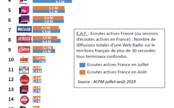 L'Alliance pour les Chiffres de la Presse et des Médias dévoile une nouvelle étude consacrée aux chiffres de diffusion des radios digitales certifiés durant les mois de juillet et d'août. L'été 2019 a confirmé la croissance de l'audio digital, la diffusion contrôlée des webradios en France a progressé de 18% en un an (juillet-août 2019 versus juillet-août 2018).
