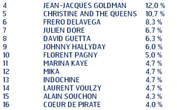 RFM avait à cœur de connaitre les préférences musicales de ses auditeurs. Pour cela, 300 auditeurs ont, au cours du mois de juillet, été interrogés par la station afin de connaître leurs chanteurs favoris. Avec 36% des voix, Calogero arrive 1er et demeure l'artiste français préféré des auditeurs de RFM. "Calogero est plus que jamais un artiste emblématique de la station" précise RFM.