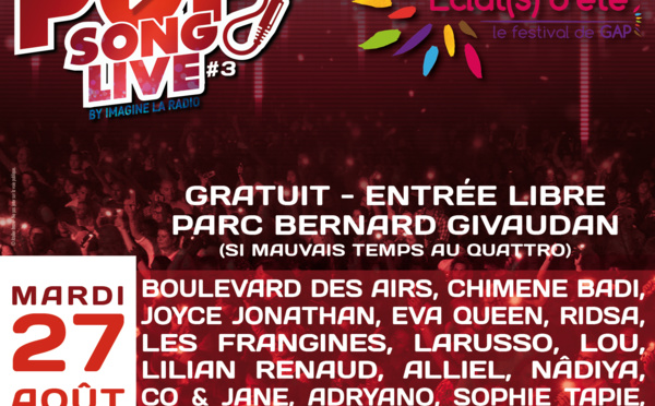 À l'occasion du lancement de sa 5e fréquence à Gap (103.1 FM) le 20 juillet dernier, Imagine La Radio offre à ses auditeurs et aux haut-alpins une 3e édition du Pop Song Live à Gap (Hautes-Alpes) mardi 27 août 20h, en étroite collaboration avec la ville de Gap.