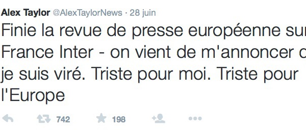 Alex Taylor qui présentait depuis 2013 la revue de presse internationale à 6h50 sur France Inter ne sera pas à l'antenne à la rentrée de septembre prochain. Il l'a annoncé lui-même ce dimanche sur son compte Twitter. Hier, la direction a répondu au journaliste en affirmant ""regretter la teneur du tweet".