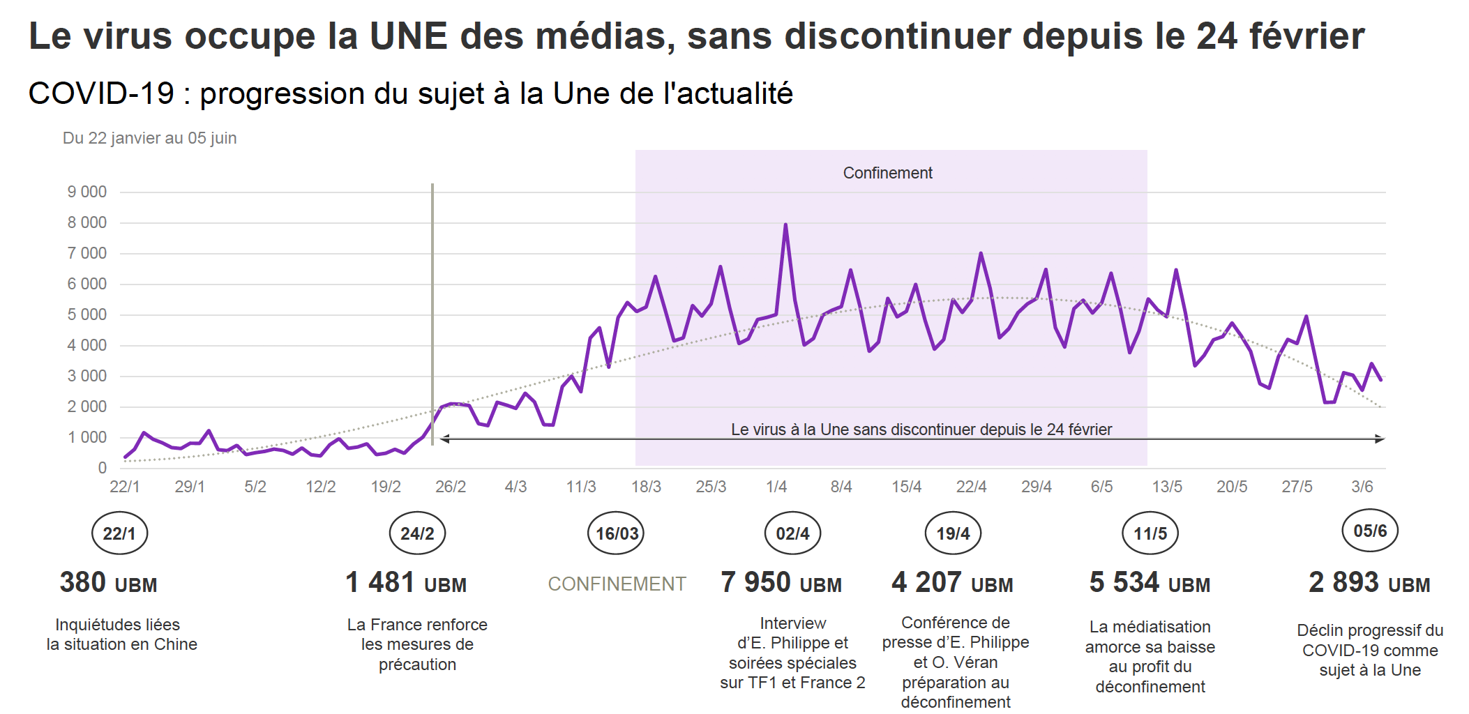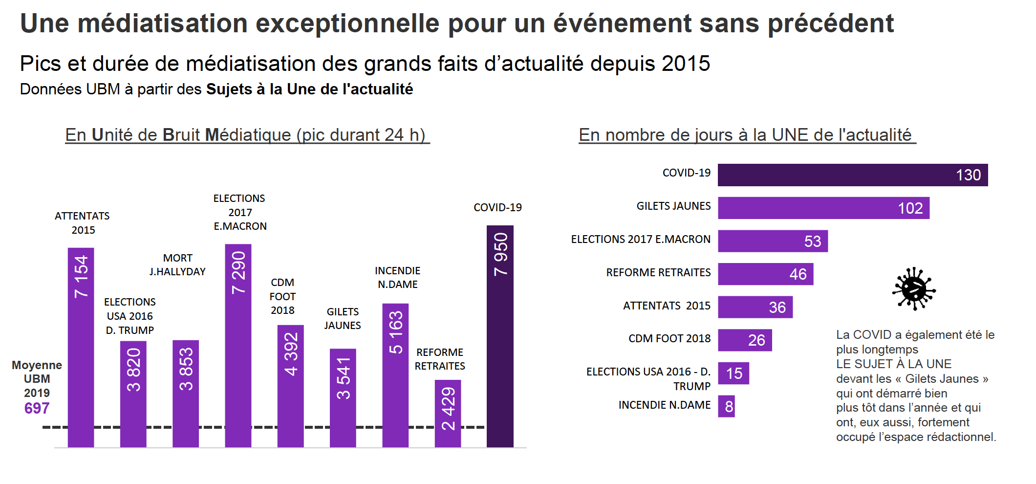 Cette crise aura connu une médiatisation exceptionnelle pour un événement sans précédent. En Unité de Bruit Médiatique comme en nombre de jours à la Une de l'actualité, le Covid-19 a, par exemple été le plus longtemps le sujet à la Une devant les "Gilets Jaunes" qui ont démarré bien plus tôt dans l’année et qui ont, eux aussi, fortement occupé l’espace rédactionnel.