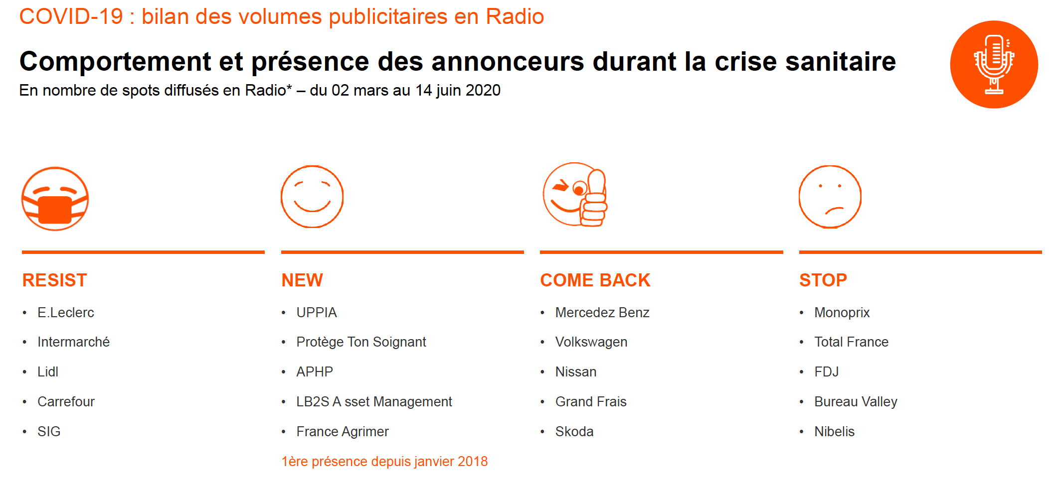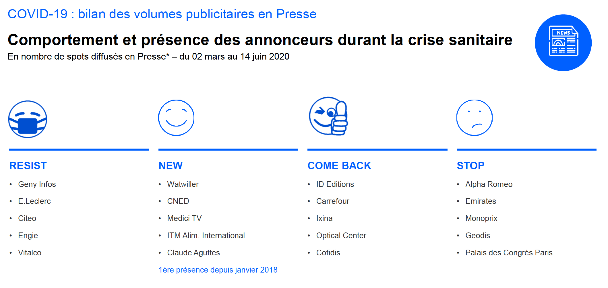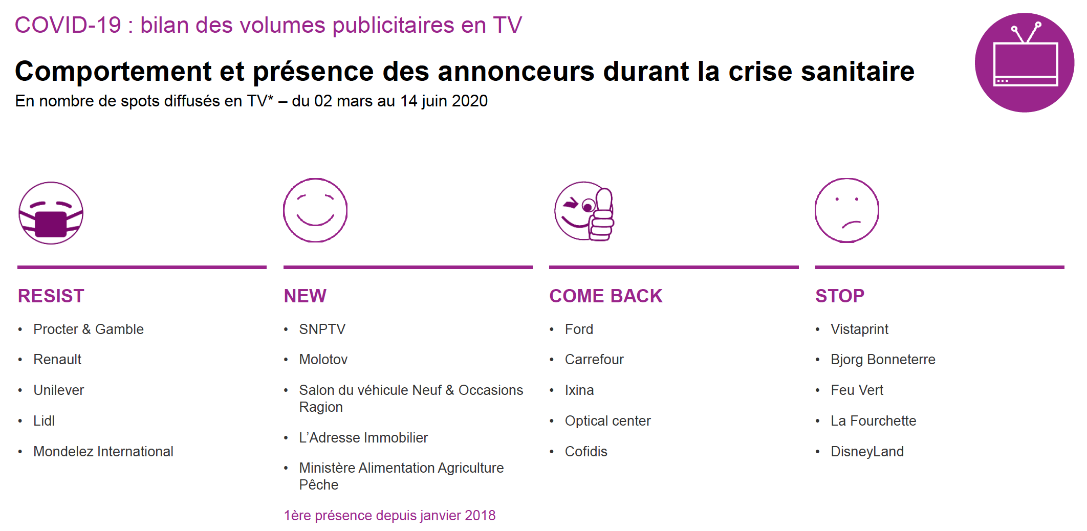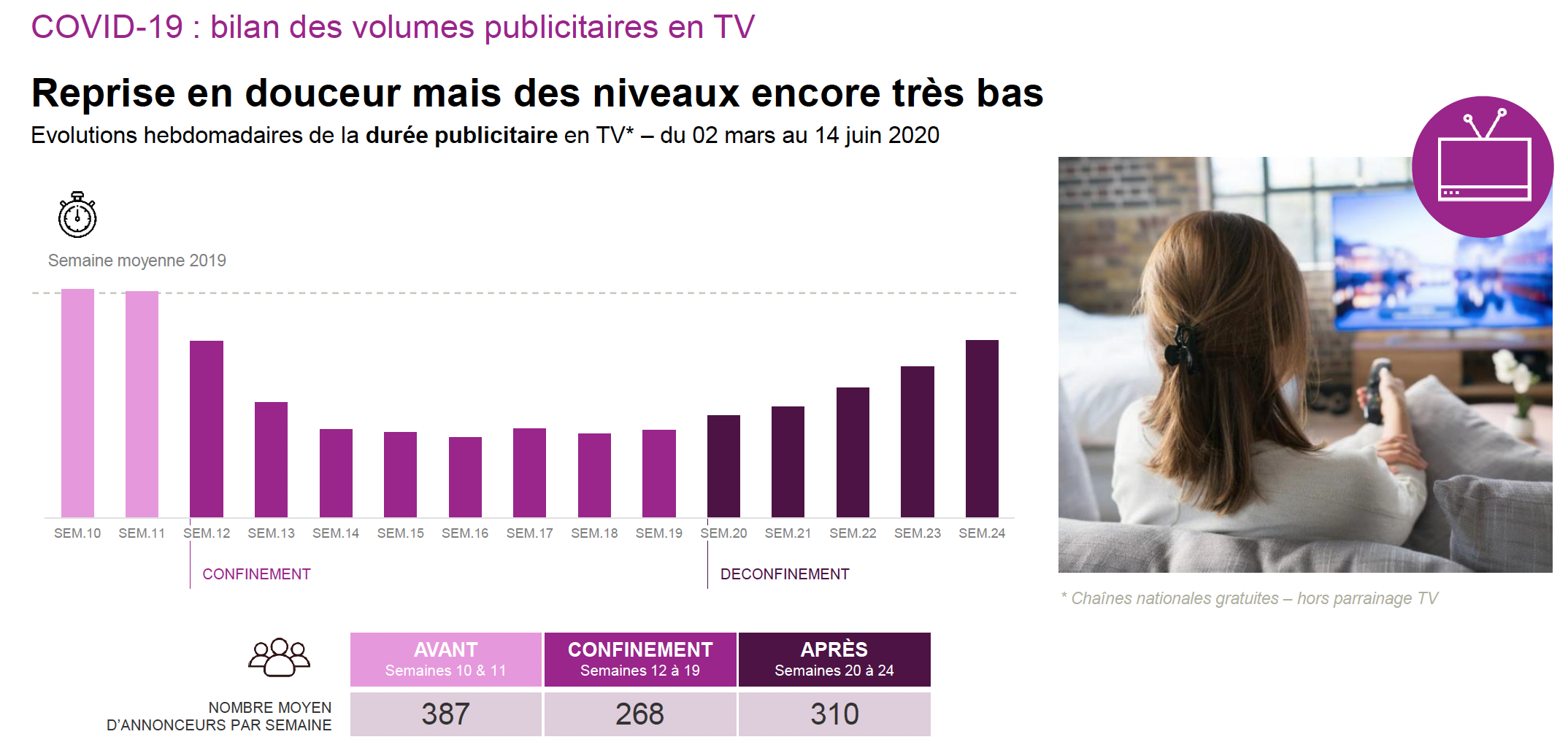La télévision enregistre une reprise en douceur mais doit toujours composer avec des niveaux encore très bas. Après une baisse brutale, l'activité en Radio repart à la hausse depuis la semaine 20 lorsque les titres de presse nationale redressent difficilement la barre.