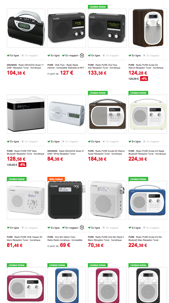 L'enseigne de grande distribution propose aussi toute une série de récepteurs permettant d'écouter les programmes en RNT.