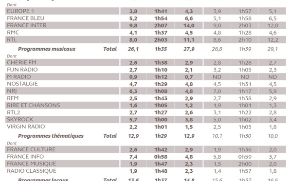 Pas de grands bouleversements dans les habitudes d'écoute, le samedi et le dimanche. Fait notable : la baisse de l'audience cumulée. En semaine, la radio enregistre 75.2% d'audience cumulée mais le week-end, ce critère baisse à 63.3%. En fin de semaine, les radios les plus écoutées sont France Inter (9.8), RTL (8.0), franceinfo (7.4), NRJ (6.3) et Skyrock (5.7). Le week-end, FIP signe la plus longue DEA : 2h33.