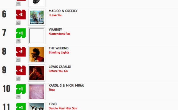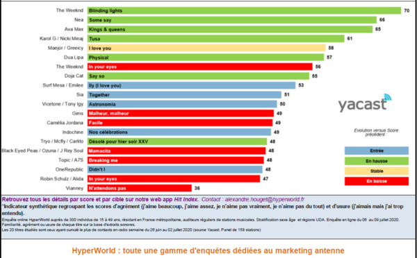 L'agrément des auditeurs aux 20 titres les plus entendus en radio (source Yacast). Une enquête HyperWorld auprès de 300 répondants âgés de 15 à 49 ans, auditeurs réguliers de stations musicales et menée du 6 au 9 juillet 2020 en France métropolitaine. Au menu de ce nouveau classement : 2 habitués et 1 nouveau visage sur le podium de l’HyperTop France.