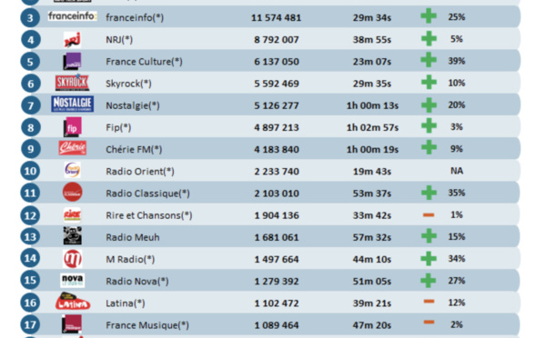 franceinfo confirme sa place de 4e radio la plus écoutée de France sur la vague mai-juin 2020. Avec 4 397 000 auditeurs quotidiens, soit 8,1% d’A.C. et une durée d’écoute de 61 minutes en moyenne, les Français ont témoigné de leur fidélité à franceinfo, portée au quotidien par "son devoir essentiel d’information et ses missions de service public".