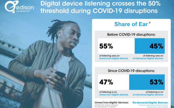 Pour la première fois depuis l'étude Share of Ear d'Edison Research et depuis que l'entreprise américaine a commencé à suivre la croissance de la consommation audio en 2014, la part quotidienne totale du temps passé à écouter sur des appareils numériques par les personnes de 13 ans et plus aux États-Unis a dépassé la part du temps passé d'écoute sur des appareils traditionnels plus linéaires.