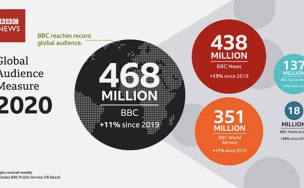 La portée mondiale de la BBC a augmenté de 11% sur un an en 2020 pour atteindre 468.2 millions de personnes par semaine, nombre le plus élevé jamais enregistré. BBC News représente 438.4 millions du total avec une augmentation annuelle de 13%. Les plateformes numériques musclent ces résultats avec une hausse de 53% des utilisateurs de BBC News.