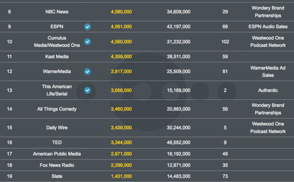 Podtrac a publié son classement des meilleurs éditeurs de podcasts pour le mois d'avril 2020. Le classement d'avril couvre 545 émissions de 170 éditeurs différents. La marque iHeartRadio a produit le plus d'émissions dans la plupart des catégories. NPR est présente dans toutes les catégories.