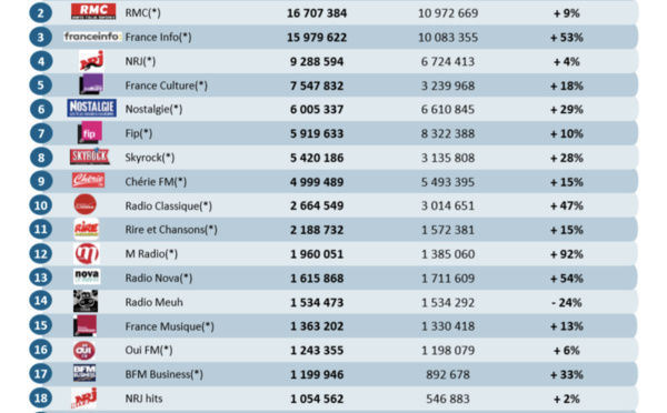 Le nombre de sessions d’écoute progresse de 20% en avril 2020 versus avril 2019. La durée quant à elle progresse de 23% sur cette même période, passant de 106 millions en avril 2019 à plus de 130 millions d'heures d'écoute en avril 2020. Ce mois-ci, deux nouvelles marques rejoignent le classement des webradios de l'ACPM : Le Bon Mix et Héros de NRJ Group.