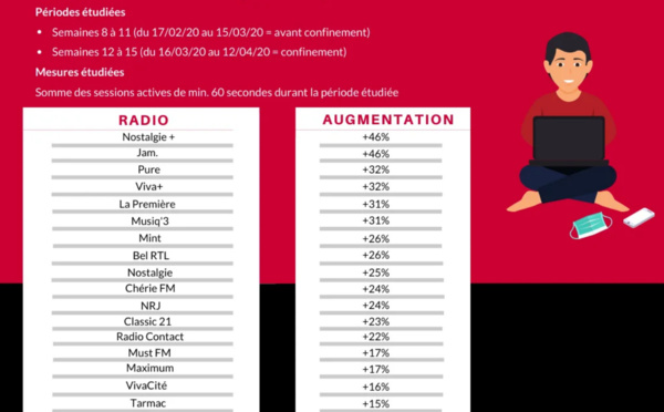 Le service d’écoute Radioplayer.be, édité par maRadio.be, vient d'analyser la consommation radio en ligne : elle a littéralement explosé pendant le premier mois de confinement, atteignant jusqu’à +46% pour certaines chaînes. En raison du télétravail et du confinement à domicile, de nombreux Belges ont modifiés leurs habitudes