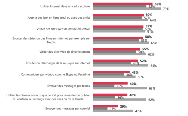 À l’image de leurs parents, dont 98% disposent d’une connexion Internet à la maison, les jeunes Québécois âgés de 6 à 17 ans sont en très grande majorité (96%) des utilisateurs d’appareils électroniques, que ce soit à la maison ou ailleurs.