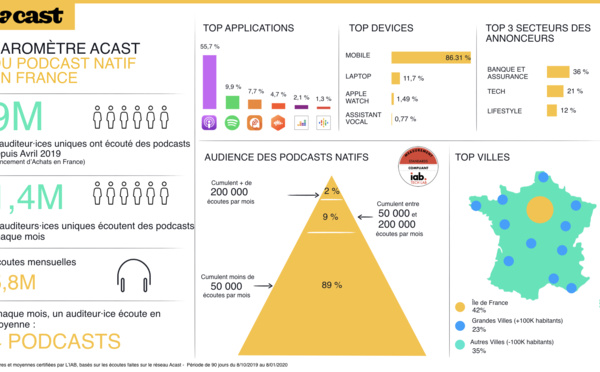 Acast a annoncé avoir généré plus de 9 millions d’auditeurs uniques sur sa plateforme (depuis son arrivée en France en avril 2019) et affirme ainsi sa position comme un des leaders du podcast en France. Selon un nouveau baromètre des podcasts natifs lancé par Acast à l’occasion du Salon de la Radio, la société a enregistré sur une période de 90 jours allant du 8 octobre 2019 au 8 janvier 2020, 5.8 millions d’écoutes mensuelles.