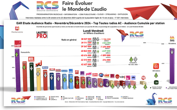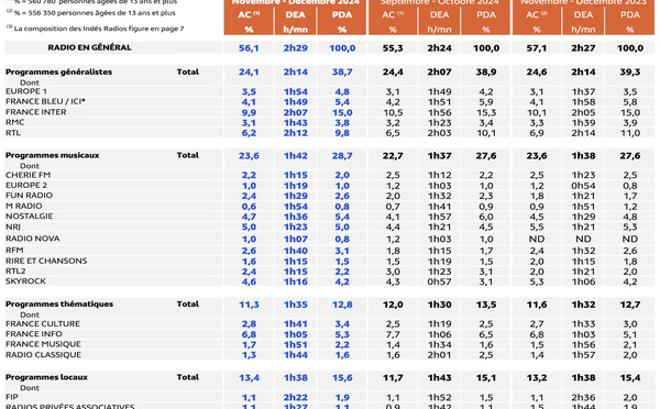Les résultats de la deuxième EAR National de la saison 2024-2025 ont été dévoilés ce matin à 08h par Médiamétrie. L'enquête compile les audiences des radios françaises générées en métropole durant la période comprise entre novembre et décembre 2024. Tour d'horizon des résultats.
