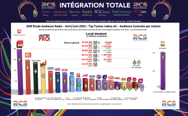 Médiamétrie vient de publier les résultats de son enquête Etude Audience Radio portant sur la période avril-juin 2023. La Lettre Pro de la Radio vous propose ses diagrammes exclusifs pour comprendre toutes les audiences et leurs incidences.