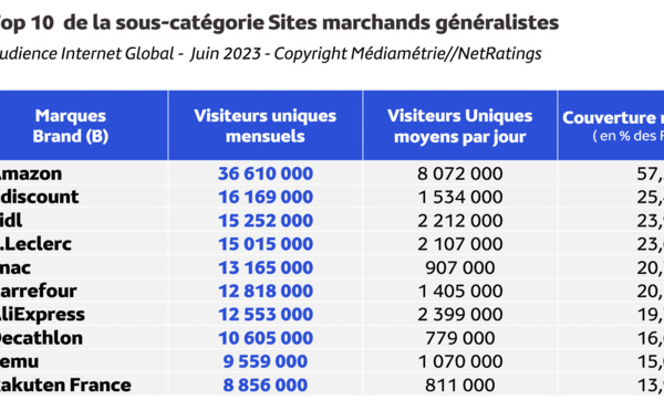 En juin 2023, plus de 7 Français sur 10 ont visité les sites marchands généralistes. Dans le sillage du début des soldes, 46.1 millions d’internautes ont visité les sites marchands généralistes au cours du mois de juin, soit plus de 7 Français sur 10 (72.4%). Parmi eux, 17.2 millions de visiteurs uniques ont fréquenté cet univers chaque jour, soit près de 3 Français sur 10 (27%).