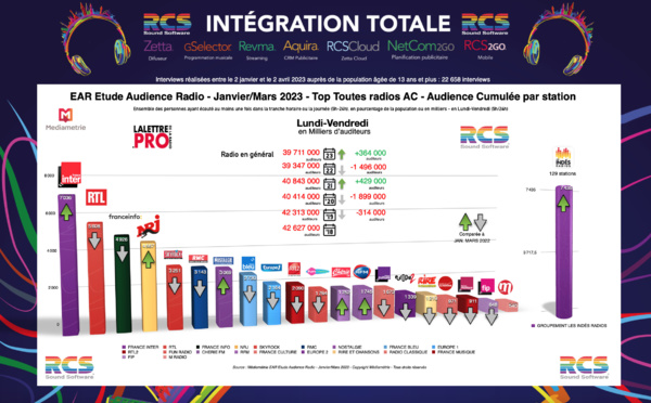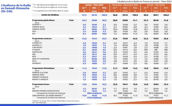 Sur la période comprise entre janvier et mars 2023, la radio a enregistré 62% d'audience cumulée en Île-de-France contre 64.4% sur la même période, il y a un an. En Île-de-France, la radio est quotidiennement écoutée par 6 384 000 auditeurs. Panorama des principaux résultats...